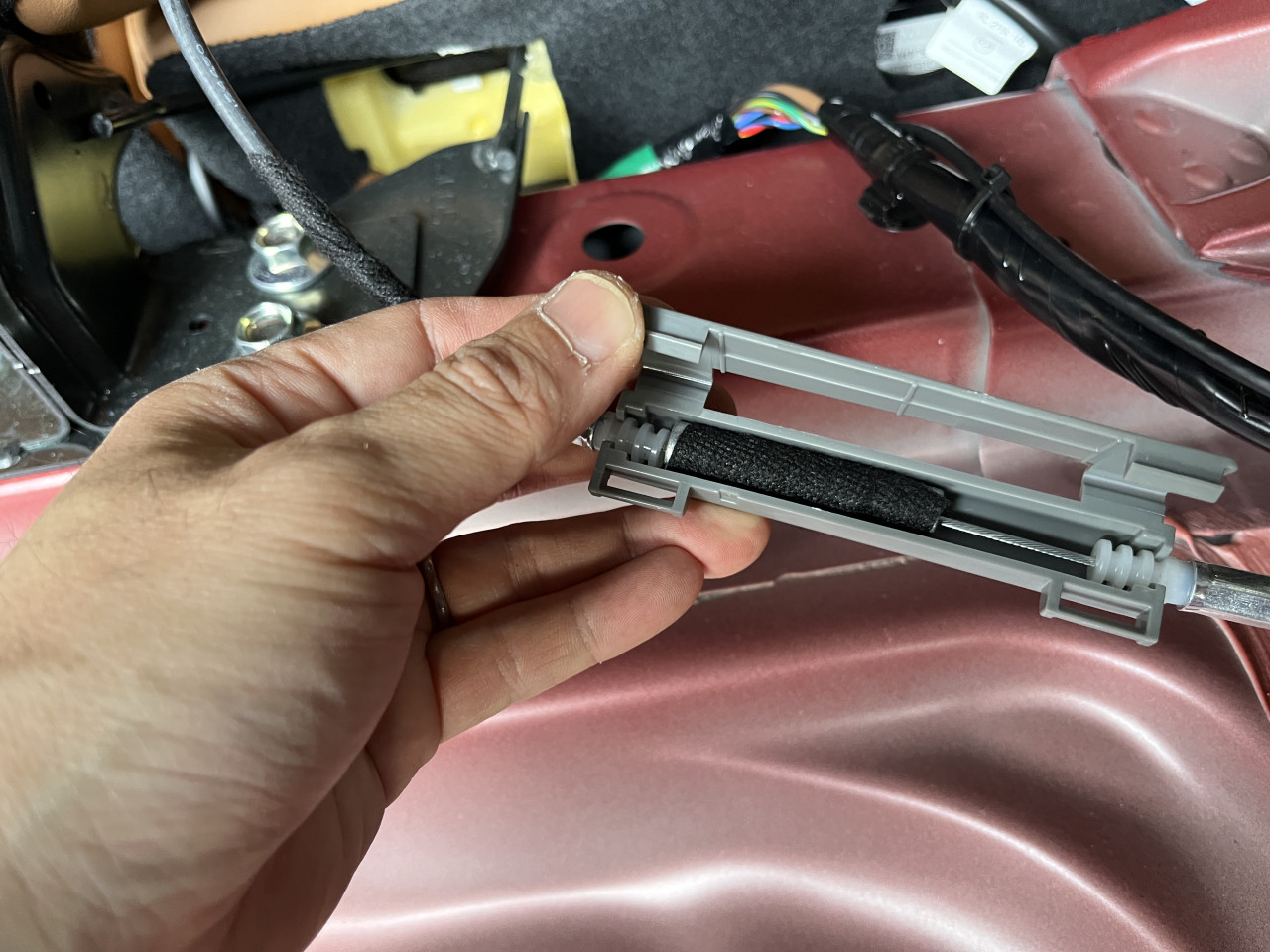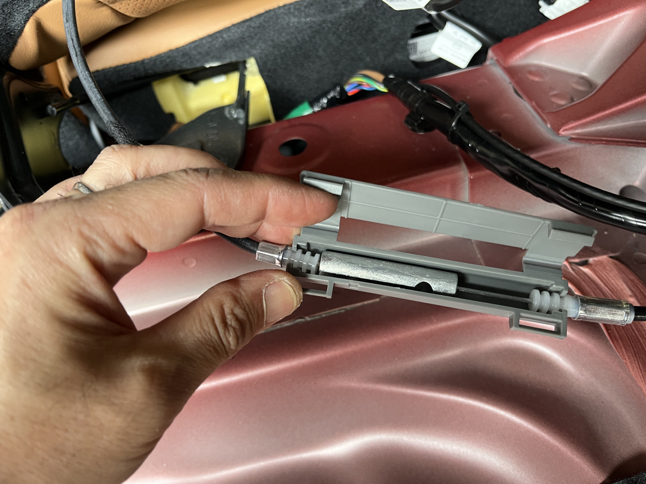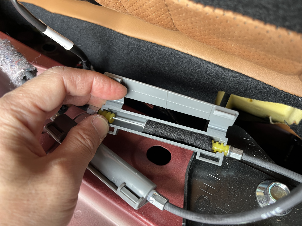 このパーツは、ラゲッジルームからリアシートを倒すレバーに繋がっているケーブルのパーツですが、内部にある稼働パーツのクリアランスが大きく、樹脂カバーと当たって音が出ています。