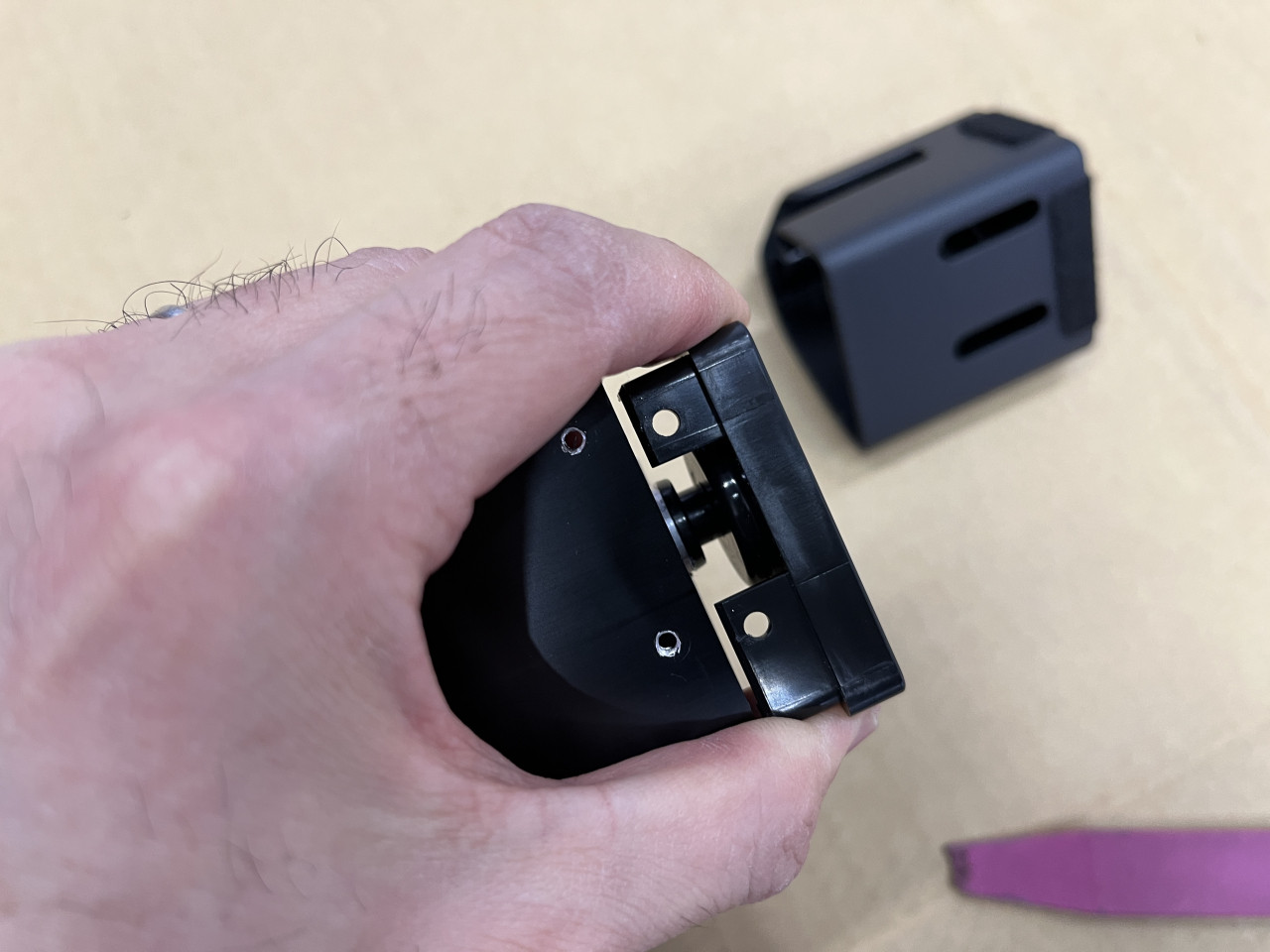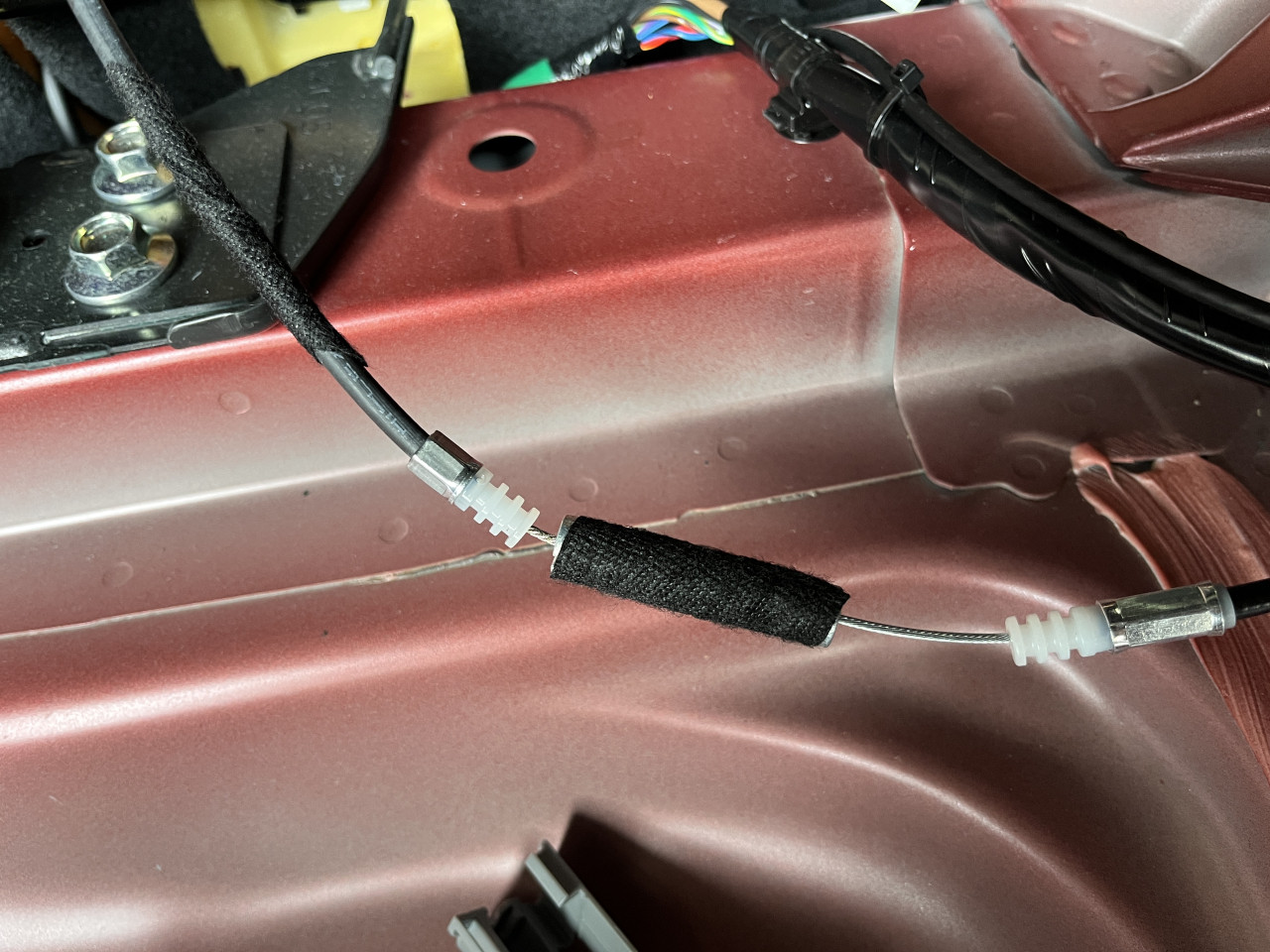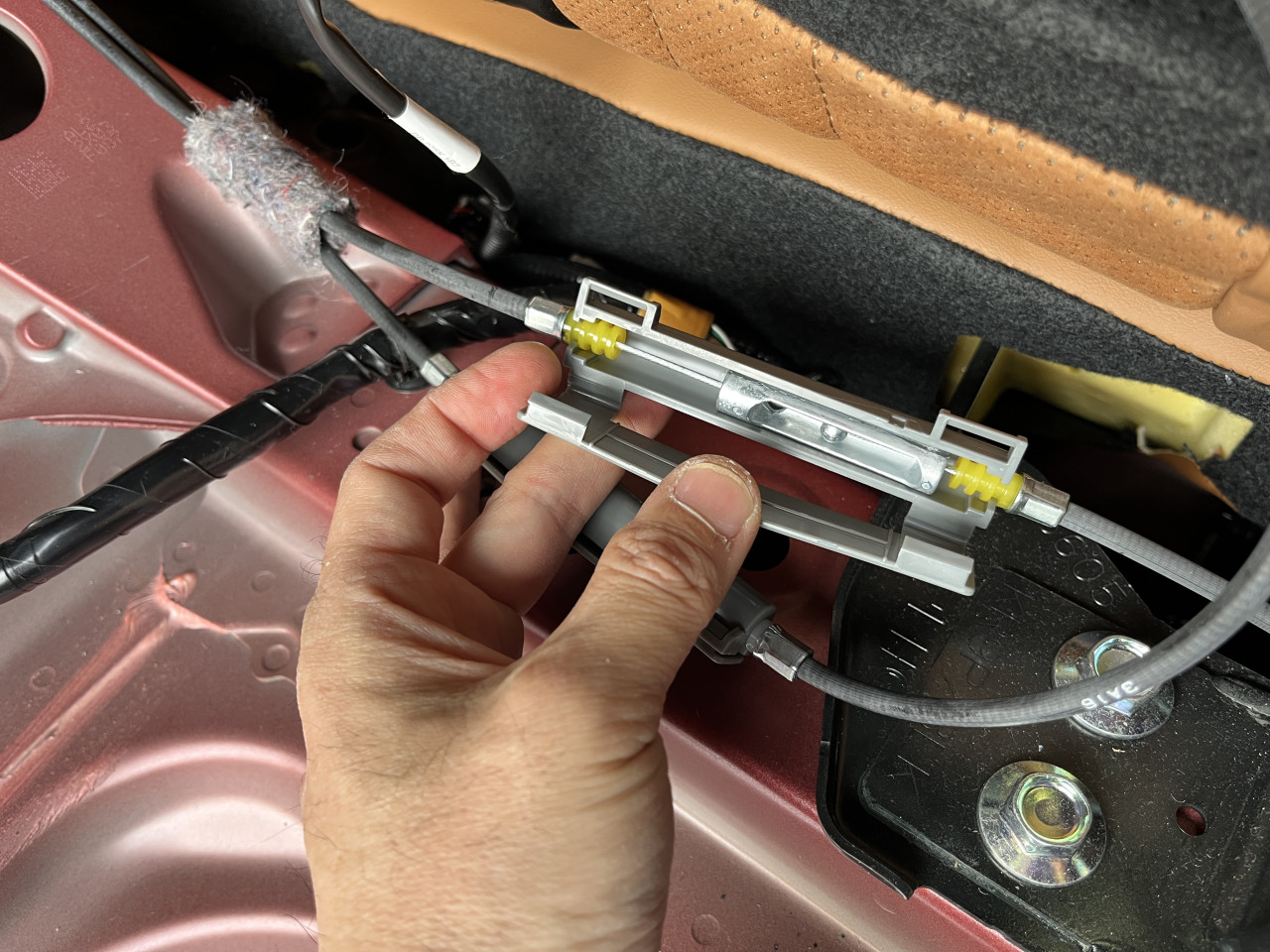 このパーツは、ラゲッジルームからリアシートを倒すレバーに繋がっているケーブルのパーツですが、内部にある稼働パーツのクリアランスが大きく、樹脂カバーと当たって音が出ています。