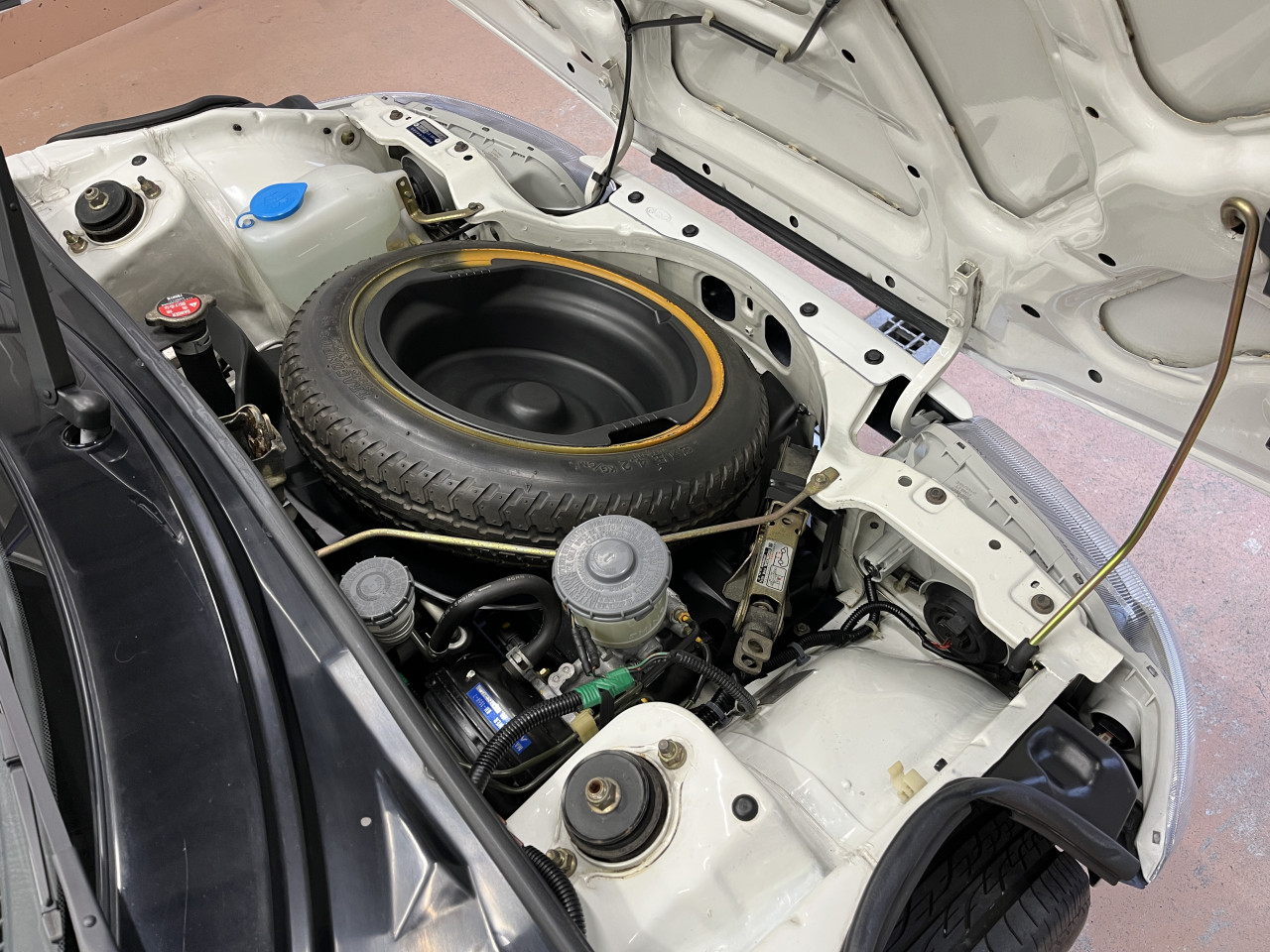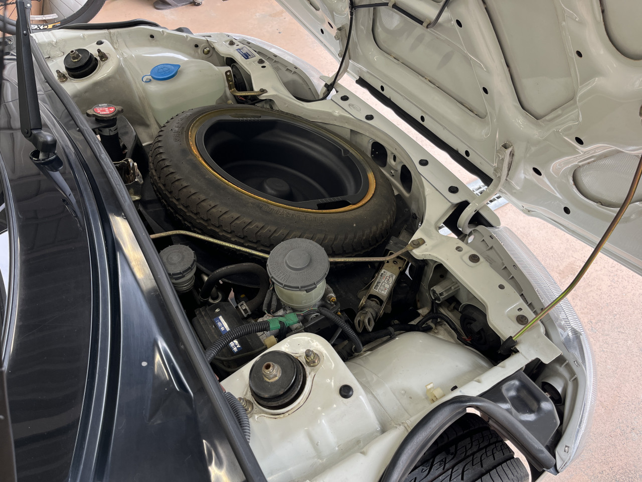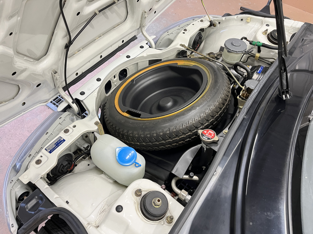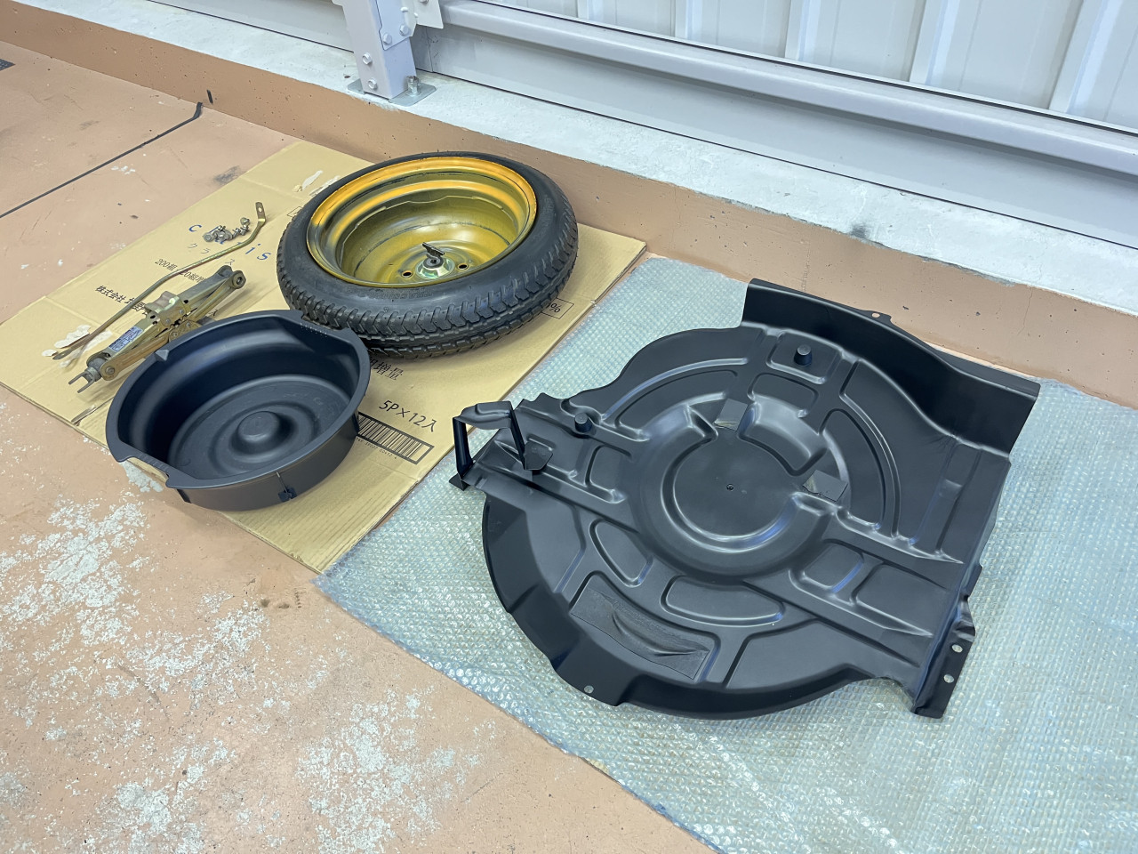 フロントボンネット内の各部清掃が終わりましたら、取り外したスペアタイヤフロアパンやフロアジャッキ、スペアタイヤ、スペアタイヤバケットなども綺麗に清掃しておきます。