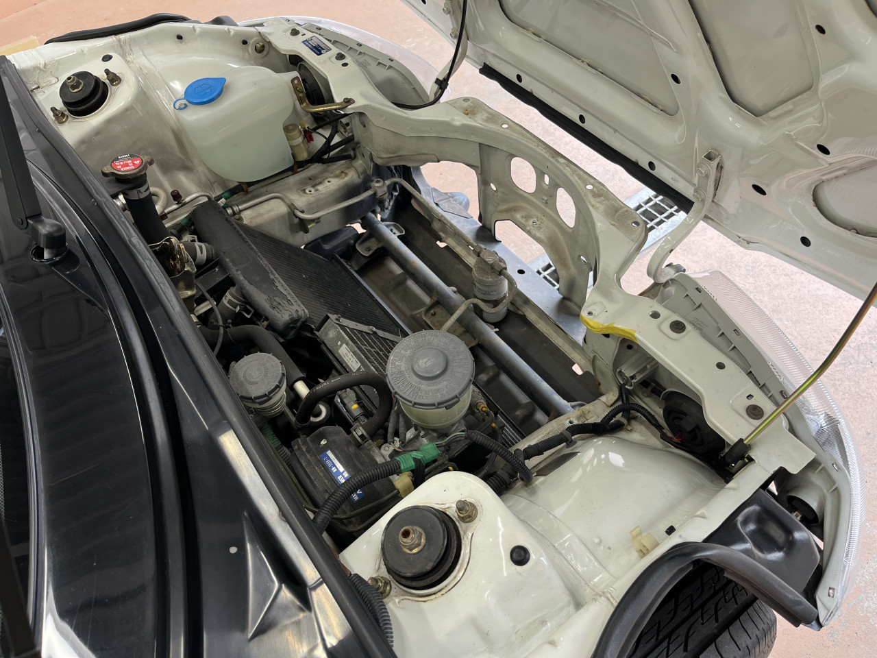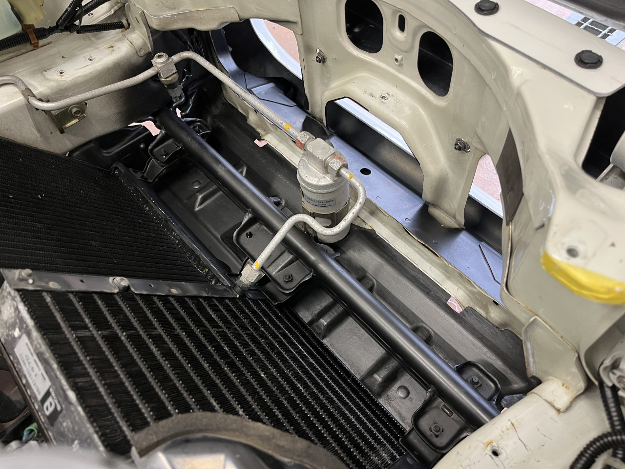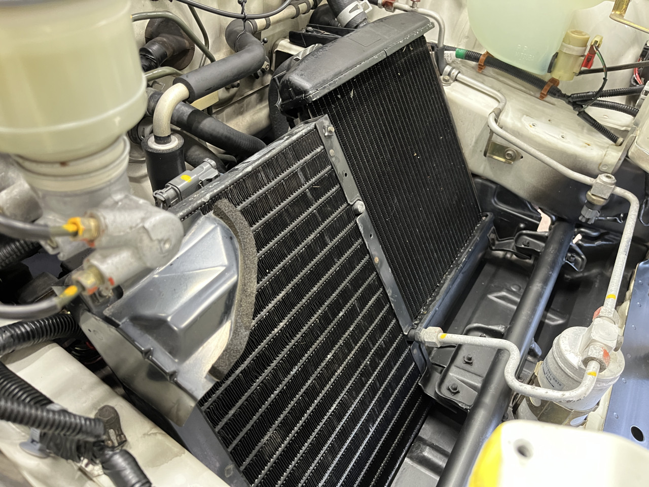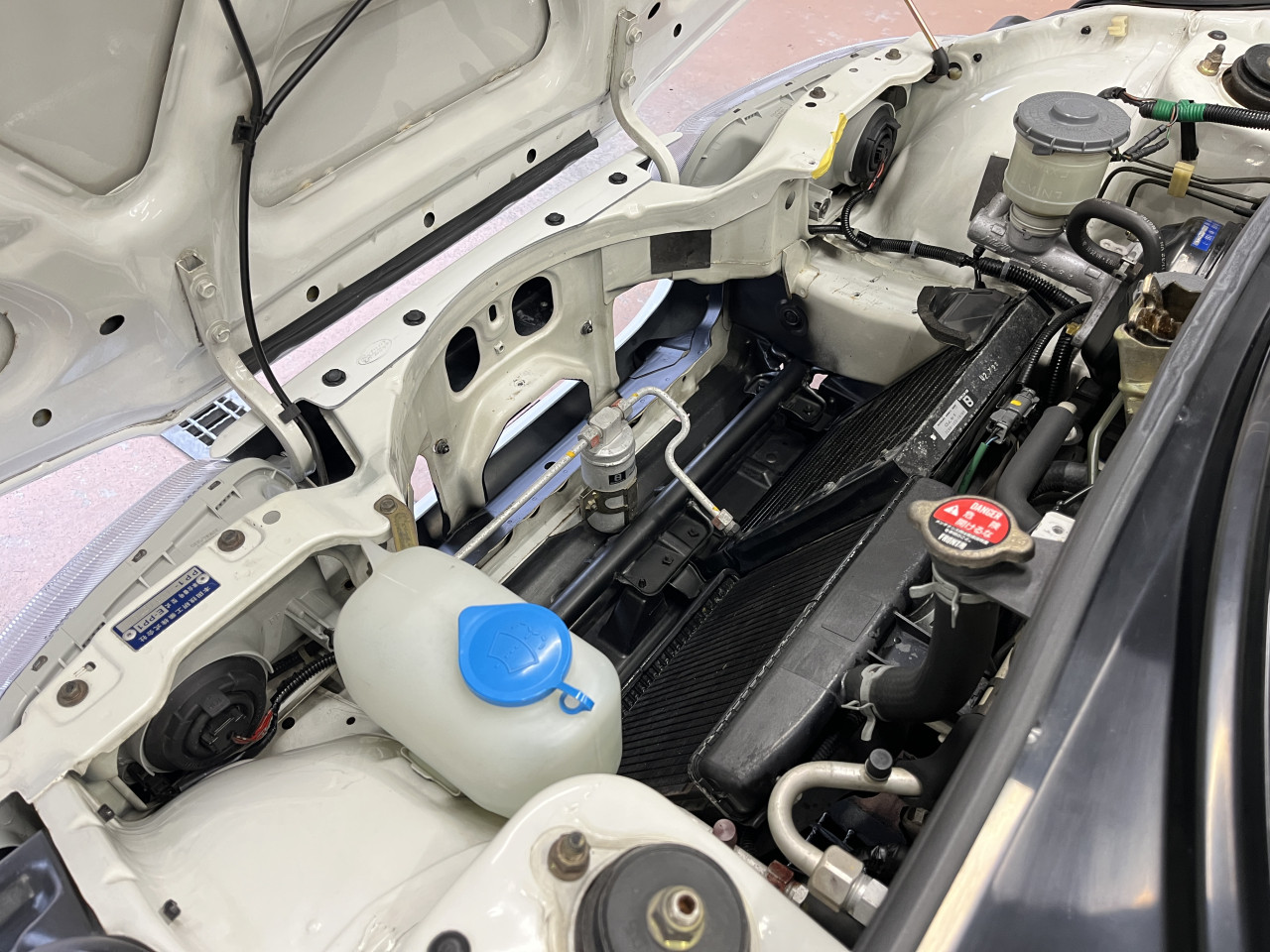 続いて各部状態確認を行いますが、フレームはもちろんのこと、フロントクロスビームやコンデンサー、エアコンレシーバータンクなどの錆が少ないことが確認でき、改めて状態の良いフロントボンネット内であることが確認できました。